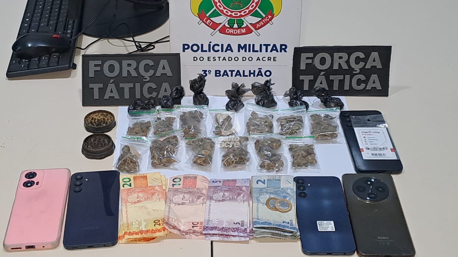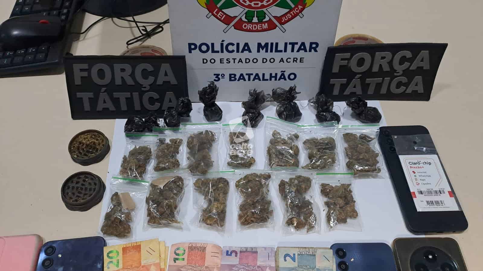No local, a equipe apreendeu papelotes de pasta base de cocaína, porções de maconha do tipo skunk e R$ 117 em espécie. Outro adolescente, de 16 anos, também foi flagrado com pequenas quantidades de entorpecentes.