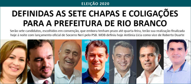 Rio Branco terá sete candidatos disputando a prefeitura. As convenções partidárias podem acontecer até quarta-feira, mas todos os partidos já definiram as coligações, confirmaram seus candidatos a prefeito e a vice em cada chapa.