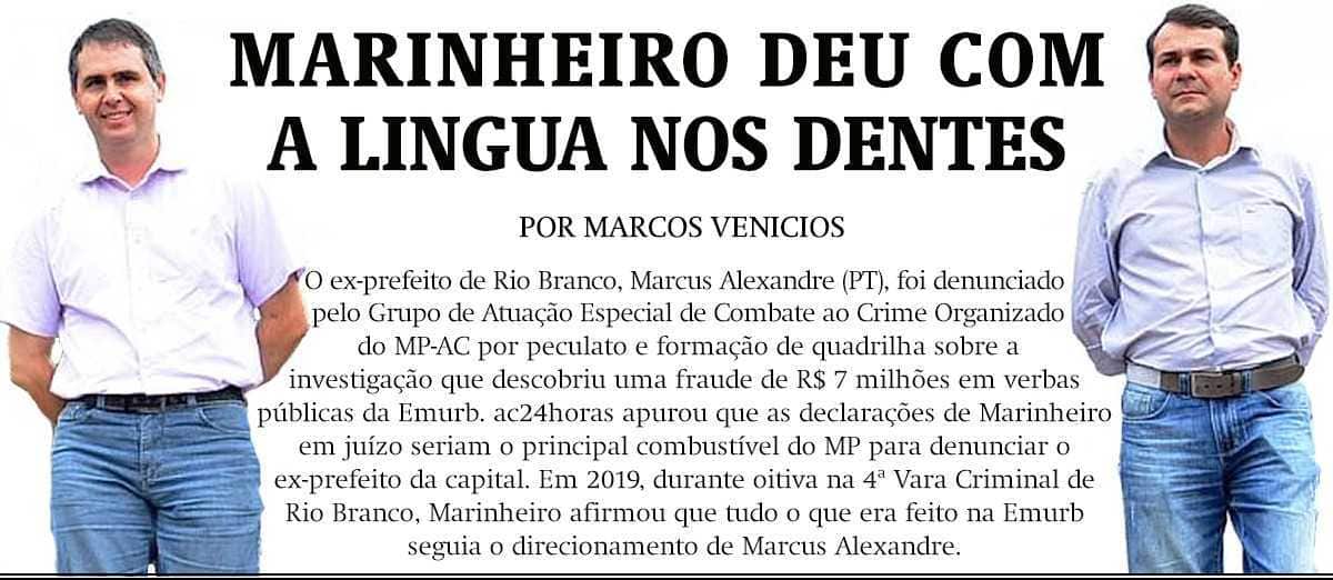 A reportagem apurou que as declarações de Marinheiro em juízo seriam o principal combustível do MP para denunciar o ex-prefeito da capital. Em 2019, durante oitiva na 4ª Vara Criminal de Rio Branco, Marinheiro afirmou que tudo o que era feito na Emurb seguia o direcionamento de Marcus Alexandre. Marinheiro aproveitou a oportunidade para afirmar que os fatos expostos contra ele eram parcialmente verdadeiros. “Os fatos contra mim são parcialmente verdadeiros porque na empresa era sim usada as medições [para resolver problemas políticos]. Meu cargo era mais executivo, meu tratamento era mais com o prefeito [Marcus Alexandre]. Eu passava a maior parte no trecho também, mas as orientações que eu recebia e a condução de como a empresa deveria seguir era dado no cargo o superior ao meu, que no caso era o prefeito [Marcus Alexandre] e muitas vezes do chefe da Casa Civil também. As medições era para atender as demandas da empresa, desde farmácia até uma pessoa que ficava doente. As medições eram utilizadas quando se precisava locar um equipamento que não estava previsto [em contrato] e precisava urgentemente locar. E as demandas políticas que foram relatadas aqui que eu confirmo todas”, revelou.