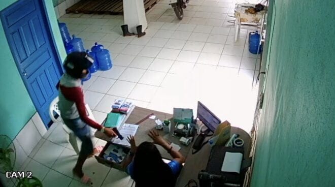 No vídeo, é registrado a chegada dos assaltantes no estabelecimento localizado na Rua Rondônia, no Bairro Samaúma, pouco depois das 15h30. A dupla pode ser a mesma que assaltou a joalheria nesta segunda (14).