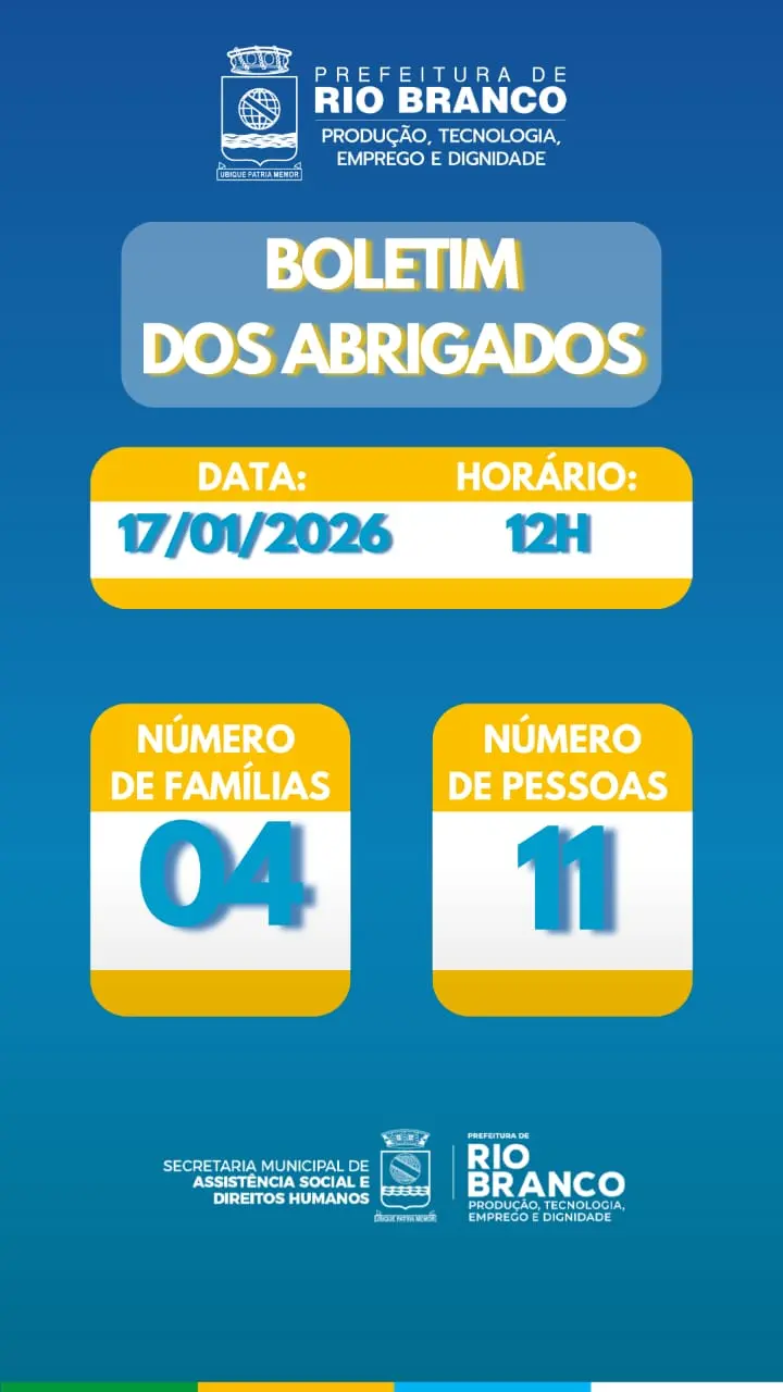 A Prefeitura de Rio Branco informou na tarde deste sábado, 17, por meio do primeiro boletim sobre famílias afetadas pela cheia do Rio Acre, que quatro famílias, totalizando 11 pessoas, estão alojadas provisoriamente no Parque de Exposições Wildy Viana, na capital acreana.