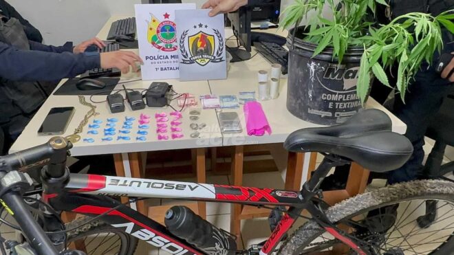 Durante a inspeção, os policiais encontraram um balde contendo uma planta de maconha na varanda, além de várias trouxinhas de cocaína, dinheiro, uma balança de precisão, uma bicicleta e materiais para embalagem de entorpecentes, indicando que o local funcionava como uma “boca de fumo”.