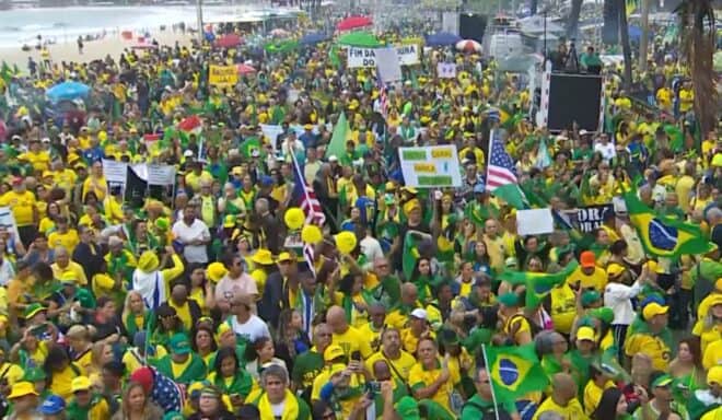 Em Copacabana (RJ), manifestantes pediam a aprovação de um projeto de anistia“ampla e irrestrita” para os envolvidos nos atos de 8 de janeiro e na trama golpista, incluindo o ex-presidente Jair Bolsonaro e membros do antigo governo.