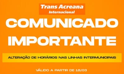 COMUNICADO – ALTERAÇÃO DE HORÁRIOS A Trans Acreana informa que, devido aos recentes aumentos no preço do combustível, impactados também por fatores e oscilações do cenário...