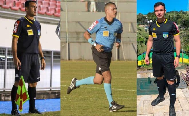 O árbitro Jackson Rodrigues, estará com os auxiliares, Renner Santos (e) e Iago Nascimento (d), no Estádio Gilberto Mestrinho, dia 8, em Manacapuru (AM) a partir das 21h (horário de Brasília)