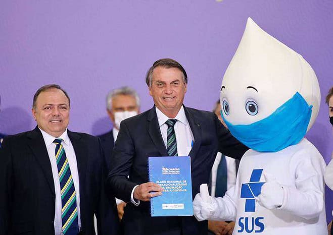 Bolsonaro recebeu o plano de vacinação das mãos de Pazuello e da coordenadora do Programa Nacional de Imunizações, Francieli Fantinato. Posou para foto ao lado do Zé Gotinha, mascote da vacinação no país.