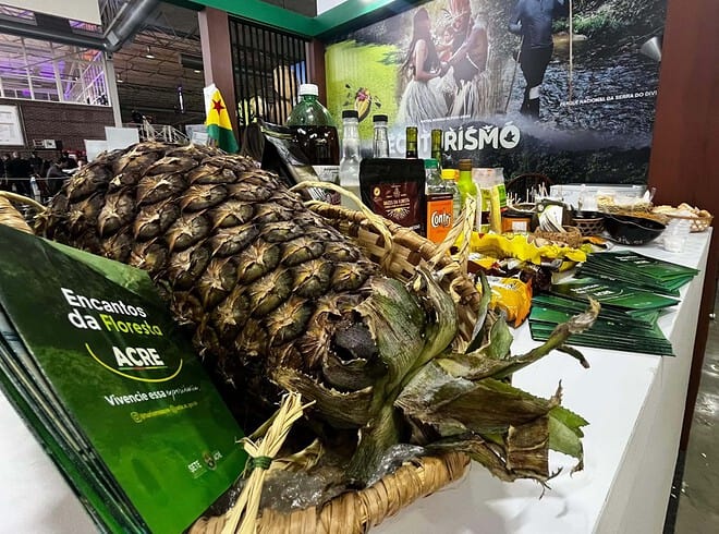 Um abacaxi gigante de 8,5kg, produzido em Tarauacá, no interior do Acre, e a união de sabores tradicionais acreanos na farofa de pirarucu seco, com castanha do Brasil torrada e banana da terra frita (famosa banana comprida entre os acreanos) são algumas especialidades acreana que têm impressionado o público no estande do Acre, na Feira Internacional de Turismo de Gramado (RS).