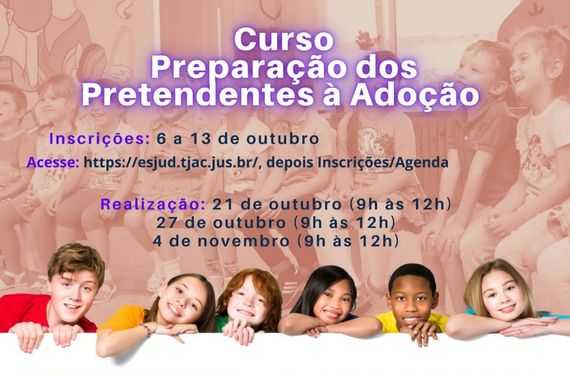 A Escola do Poder Judiciário (Esjud) está com as inscrições abertas para o ‘Curso Preparação dos Pretendentes à Adoção’. Os interessados podem se inscrever até o dia 13 de outubro de 2022. A atividade é destinada somente aos pretendentes à adoção com processo de habilitação em tramitação na 2ª Vara da Infância e Juventude. São 34 vagas disponíveis.