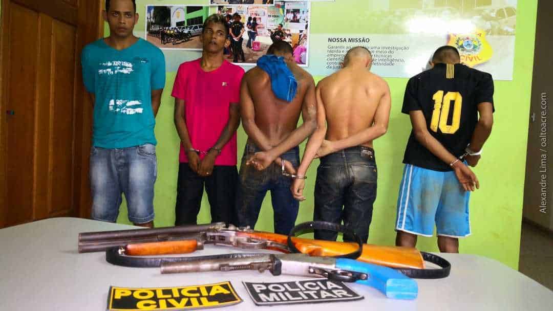 Estão detidos na delegacia de Epitaciolândia desde o início da tarde desta segunda-feira, dia 29, quatro menores e dois maiores, juntamente com duas armas tipo escopeta calibre 12. Mais dois já foram identificados e estão sendo procurados pela fronteira.
