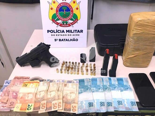 Dentro da casa que liberada para ser revistada, foram encontrados vários indícios que comprovou a denúncia. Um ‘tijolo’ de maconha tipo ‘skunk’, vários tabletes prontos para serem comercializados, uma quantia de R$ 6 mil reais provenientes do comércio ilegal da droga, além de uma pistola 380 com a numeração raspada e munição.