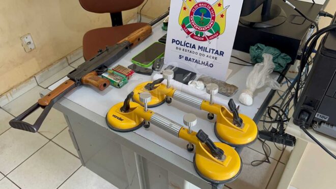 Dentro da casa foi encontrada uma arma tipo fuzil de calibre 22, munições e uma balança de precisão, maconha e cocaína, caracterizando que ali era um pequeno ponto de venda de droga.