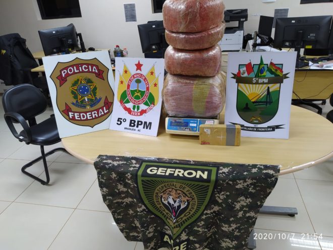 A dupla foi presa em flagrante delito e para piorar, dentro de outra bolsa, havia um ‘tijolo’ de cocaína pura. Toda a carga e a dupla foi algemada e conduzida para a delegacia da Polícia Federal em Epitaciolândia, onde foi efetuado o Boletim de Ocorrência (B.O.).