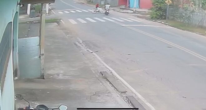 As vítimas foram identificadas como Rivelino, que conduzia a bicicleta, e Erick, motociclista. Imagens de câmeras de segurança instaladas em estabelecimentos da região flagraram o momento exato da colisão, ocorrida quando ambos os veículos se aproximavam de um cruzamento. O impacto foi forte e provocou a queda violenta dos dois condutores.