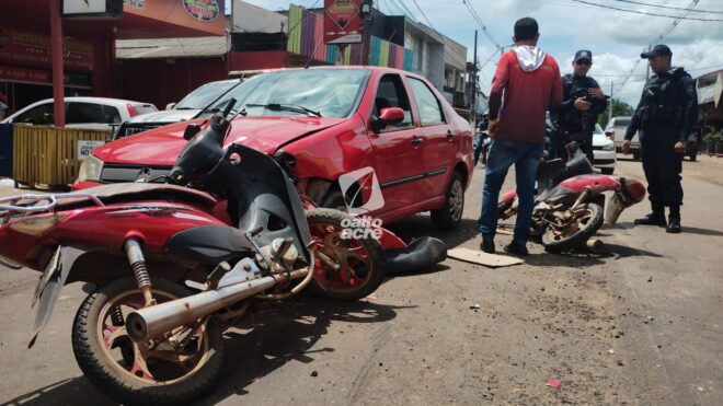 Um acidente de trânsito envolvendo um carro e duas motocicletas deixou feridos na tarde desta terça-feira (11) na Avenida Manoel Marinho Monte, em frente ao Armazém Paraíba, no município de Brasiléia.