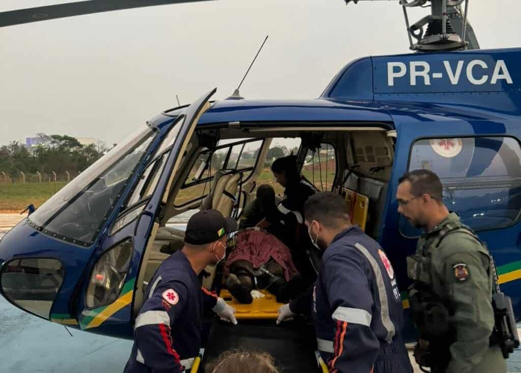 Com a coordenação da equipe do Samu e da Polícia Militar, o helicóptero pousou na estrada, que foi fechada para facilitar a remoção da vítima