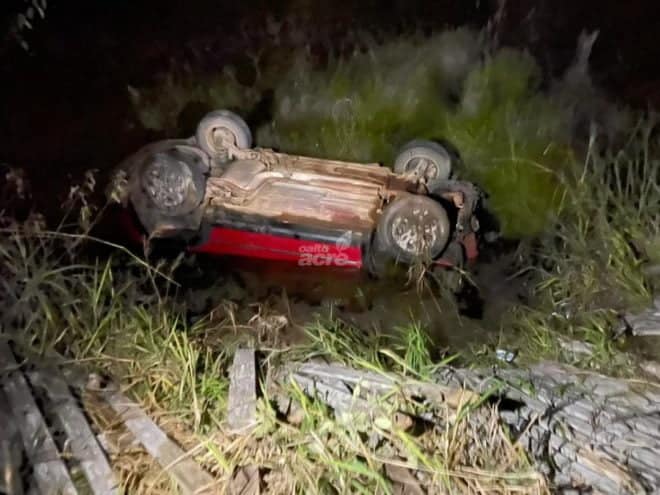 Um carro modelo Fiat/Palio Wekeend que se deslocava pela BR 317 (Estrada do Pacífico, sentido Assis Brasil/Brasiléia, perdeu o controle no km 60 em uma reta, indo capotar por algumas vezes e caiu fora da estrada dentro de um brejo.