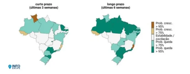 Em nível nacional, foi observada ‘manutenção de queda ou estabilização, na população adulta, dos casos positivos para Sars-CoV-2 e influenza A na maioria dos estados’. Nos dois estados onde foram identificados o crescimento a longo prazo, os casos se concentram nas crianças e pré-adolescentes de 5 a 14 anos.