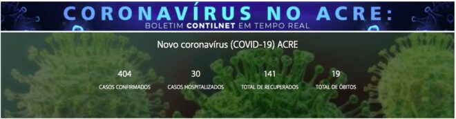 Acre confirma mais 50 casos de Covid-19 e totaliza 404 registros e 19 mortes pela doença