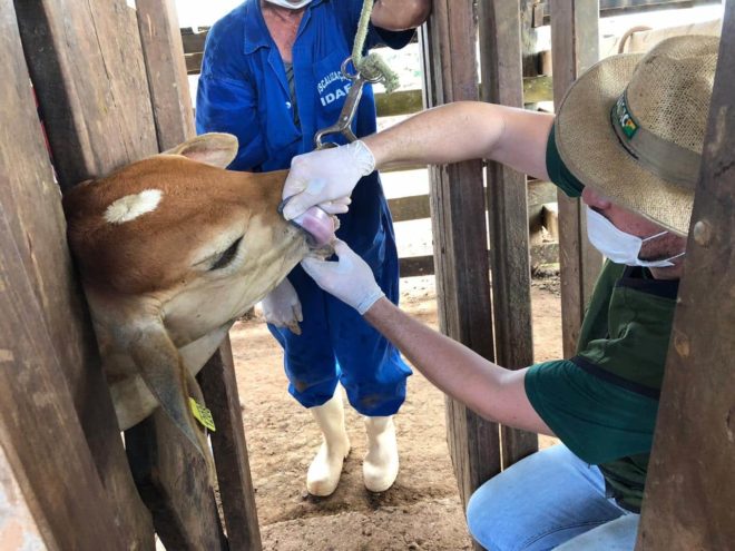 No Acre, foram selecionadas 17 propriedades rurais, distribuídas nos municípios de Rio Branco, Feijó, Tarauacá e Cruzeiro do Sul, onde será colhido amostra de sangue de, aproximadamente, 500 bovinos e realizadas inspeções clínicas e conferências de rebanho, visando a nova condição sanitária.