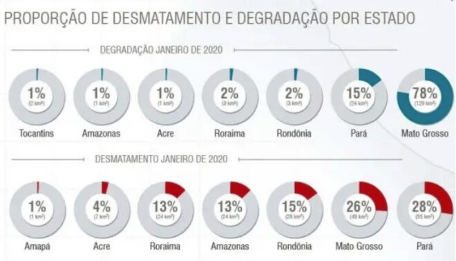 No contexto da degradação, neste começo de 2020, segundo o Imazon, a área total de floresta degradada saltou de 11 km², em janeiro do ano passado, para 163 km², em janeiro deste ano. O Mato Grosso liderou o ranking com 78% da degradação na região, seguido de Pará (15%), Rondônia (2%), Roraima (2%), Acre (1%), Amazonas (1%) e Tocantins (1%).