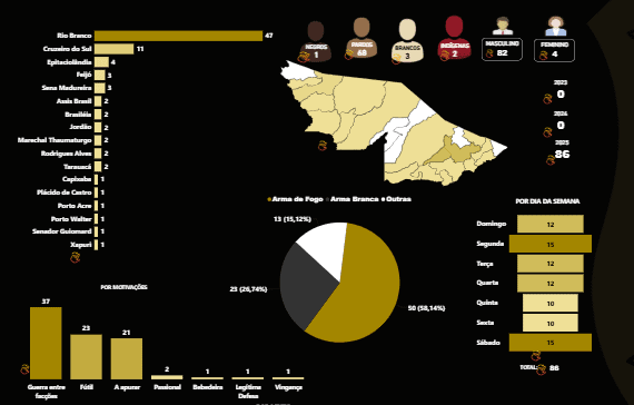 O Acre contabilizou 86 homicídios entre janeiro e julho de 2025, segundo levantamento exclusivo do painel de criminalidade da Polícia Civil do Estado. Os números revelam um cenário de violência marcado pelo domínio das facções criminosas, responsáveis por 43% dos casos registrados.