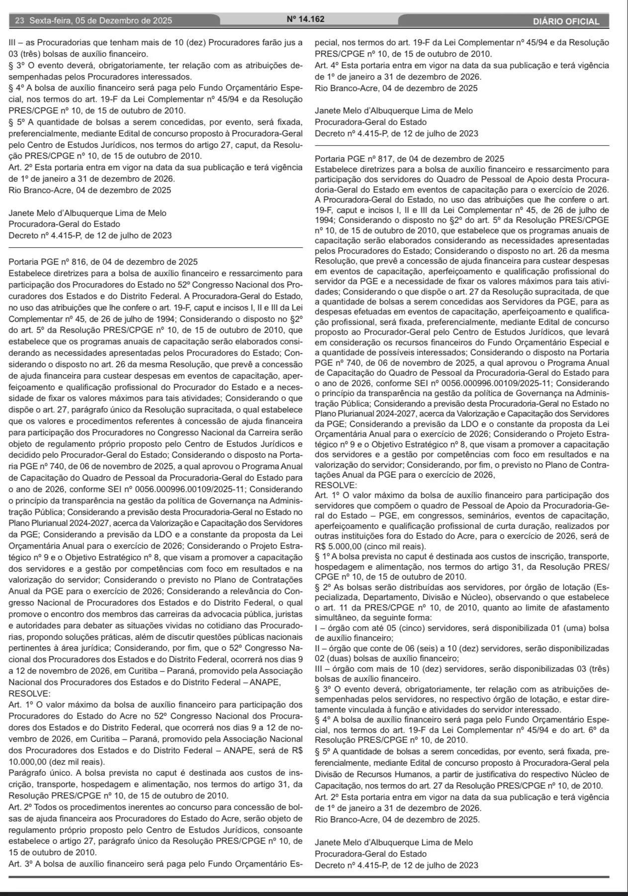 A Procuradoria-Geral do Estado do Acre (PGE) publicou, nesta sexta-feira, 5, duas portarias que estabelecem as diretrizes para concessão de bolsas de auxílio financeiro e ressarcimento destinados à participação de procuradores e servidores em eventos de capacitação no exercício de 2026. As medidas constam nas portarias PGE nº 816/2025 e PGE nº 817/2025, ambas assinadas pela procuradora-geral do Estado, Janete Melo d’Albuquerque Lima de Melo.
