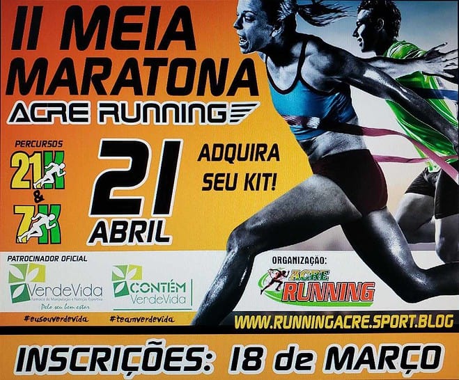A Acre Running Eventos, que tem como uns de seus objetivos gerar saúde, turismo e movimentar as pessoas que gostam e praticam a Corrida de Rua, promovendo o esporte com caráter socioeducativo, fundamentado na participação e na formação das pessoas, tendo em vista a valorização humana, a promoção social e a melhoria da qualidade de vida, abrirá nesta segunda-feira dia 18.03, as inscrições da 2ª Meia Maratona Acre Running, em comemoração de seus 2(dois) anos de atuação na realização de eventos esportivos no estado do Acre.