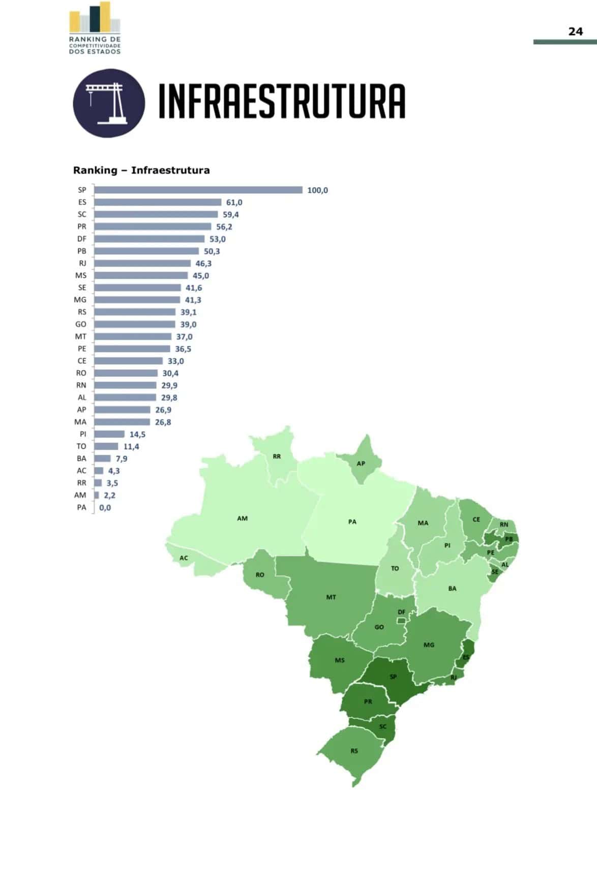O ranking avalia diversos indicadores relacionados ao acesso, custo e qualidade dos serviços de infraestrutura, como telecomunicações, energia, rodovias, saneamento básico e transporte aéreo. O estado mais bem posicionado é São Paulo, com nota máxima (100 pontos), enquanto o último colocado é o Pará.