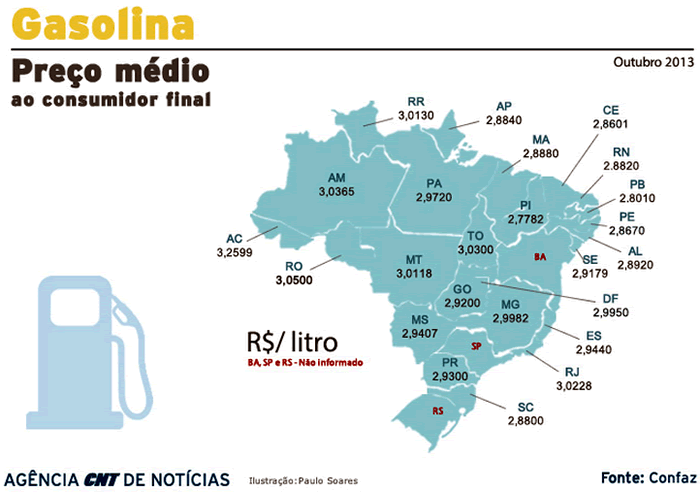No caso do álcool, os valores mais elevados, depois do Acre, são os cobrados em Roraima (R$ 2,55), Espírito Santo (R$ 2,54), Amapá (R$ 2,50), Alagoas e Pará (R$ 2,47). A maior economia será de quem abastecer em Goiás (R$ 1,92), Mato Grosso (R$ 1,96), Mato Grosso do Sul (R$ 1,97), Paraná (R$ 1,99) e Minas Gerais (R$ 2,11).