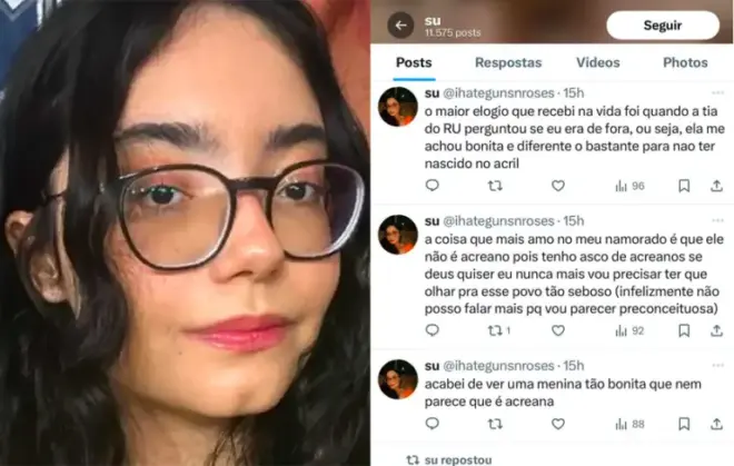Assúria Mesquita, de 20 anos, estudante de Medicina da Universidade Federal do Acre (Ufac), que causou revolta ao publicar no X (antigo Twitter) mensagens ofensivas aos acreanos na última quarta-feira (9), ingressou no curso na 2ª edição do Sistema de Seleção Unificada (Sisu), em 2022, utilizando o bônus regional para estudantes que cursaram o ensino médio em instituições acreanas.
