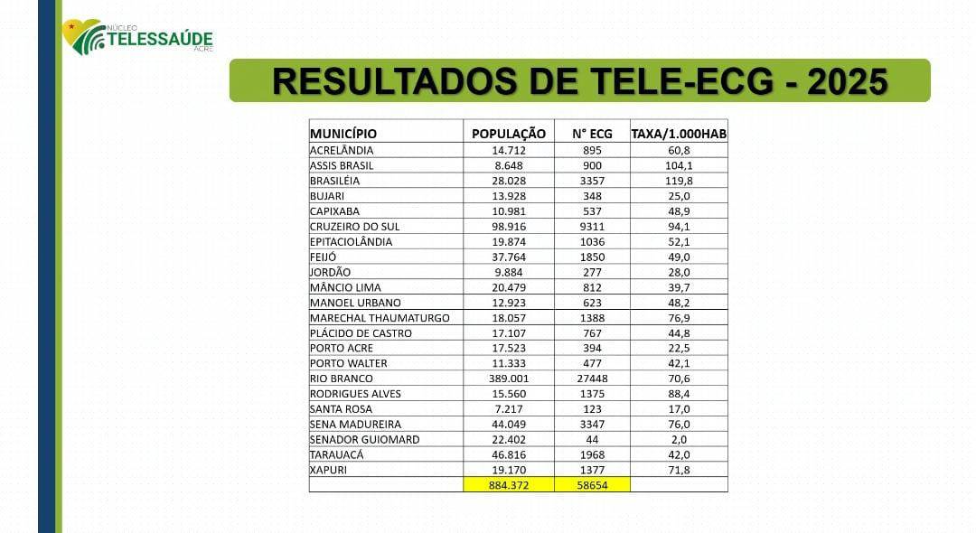 De acordo com o levantamento, Brasileia atingiu a marca de 119,8 eletrocardiogramas por mil habitantes, resultado da realização de 3.357 exames ao longo do ano de 2025.