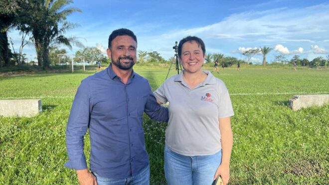 Adem Araújo, vice-presidente da FAAC, juntamente com a representante da CBF, durante visita onde será construído o novo estádio patrocinado pela entidade esportiva – Foto: Alexandre Lima