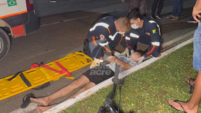 Um adolescente de 14 anos ficou ferido na noite deste sábado (21) após ser atropelado por uma motocicleta na Avenida Ceará, no bairro Abrahão Alab, em Rio Branco. O acidente ocorreu enquanto o jovem empinava sua bicicleta e acabou invadindo inadvertidamente a pista por onde trafegava um motoboy.