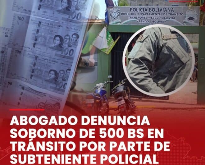 Um subtenente da Direção Departamental de Trânsito de Cobija, no departamento de Pando, foi preso em flagrante após ser denunciado por cobrança irregular de 500 bolivianos a uma pessoa que pilotava motocicleta sem documentação e em aparente estado de embriaguez. A prisão ocorreu após o advogado Dr. José Luis Vargas convocar a imprensa local para acompanhar o caso.