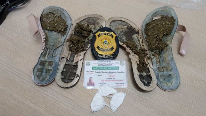 Durante procedimento de revista para entrada de visitantes da Unidade Penitenciária Manuel Neri da Silva, em Cruzeiro do Sul, Agentes Penitenciários deram voz de prisão, na manhã deste sábado, 09, a duas visitantes que tentavam entrar com substâncias entorpecentes. As substâncias estavam acondicionadas nos solados das sandálias das mulheres.