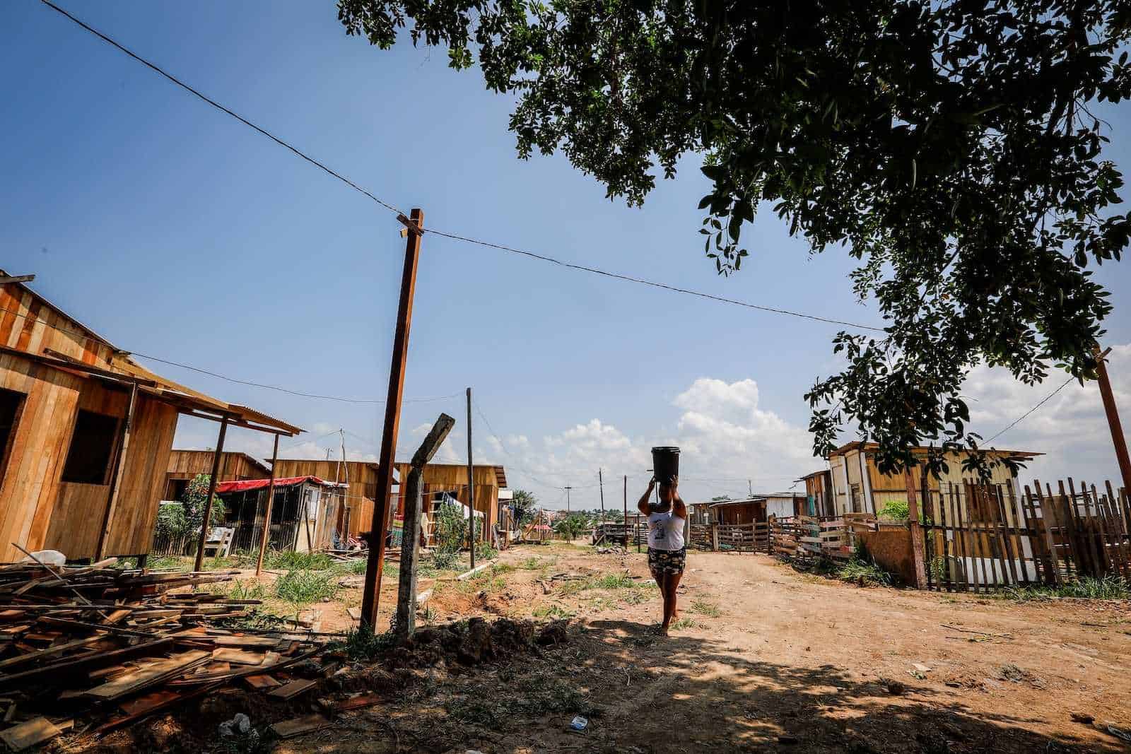 Com um balde na mão e um filho no braço, Cristina Santos caminha apressada rumo a caixa d’água coletiva da comunidade Mariele Franco onde ela mora, na parte alta de Rio Branco.