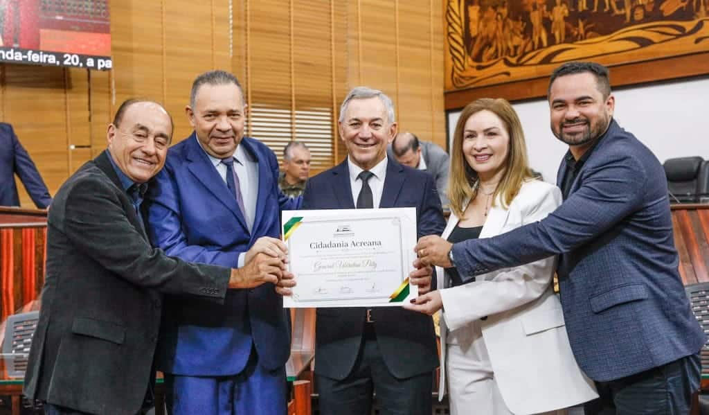 Em sessão solene realizada na manhã desta sexta-feira (17), a Assembleia Legislativa do Estado Acre (Aleac) homenageou o General Ubiratan Poty, diretor do Programa Calha Norte, com a entrega do título de Cidadão Acreano. A honraria é concedida anualmente a personalidades indicadas pelos deputados que compõe o parlamento estadual.