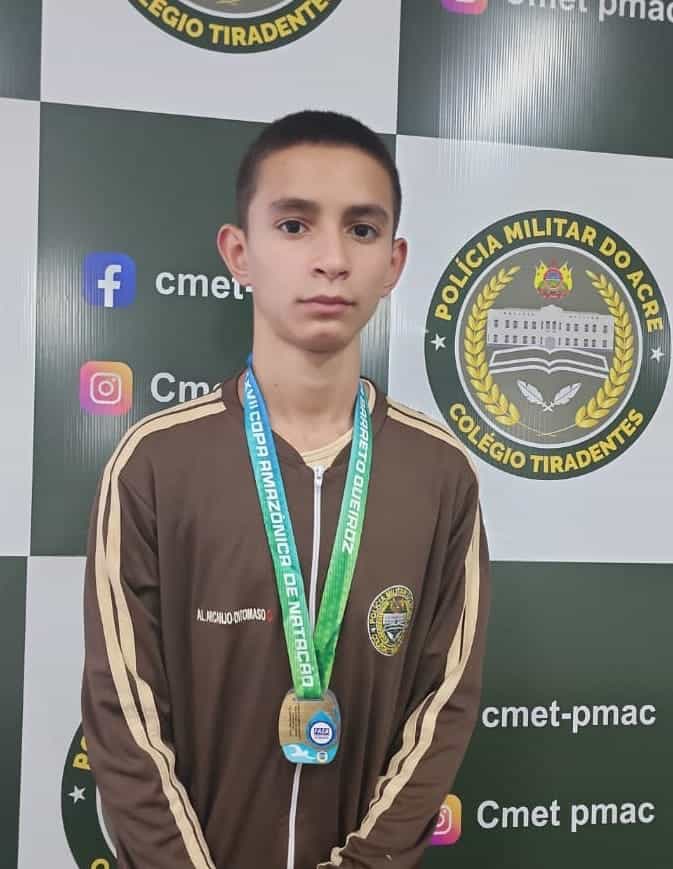 O talento e a disciplina dos alunos do Colégio Militar Estadual Tiradentes (CMET), gerido pela Polícia Militar do Acre (PMAC) continuam se destacando dentro e fora do Estado. O estudante Miguel Arcanjo Souza Ditomasio, do 8º Ano, conquistou medalha de ouro na XXVII Copa Amazônica de Natação, realizada na AABB, em Rio Branco. A competição reuniu atletas do Peru, Bolívia, Rondônia e Acre, reforçando o nível internacional do evento.
