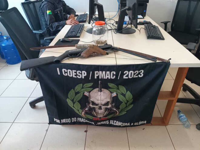 Na manhã desta sexta-feira, 17, alunos do 1° Curso de Operações Especiais (Coesp), da Polícia Militar do Acre (PMAC), apreenderam uma arma de fogo de fabricação caseira, outra adaptada e prenderam um foragido da justiça. O fato ocorreu no bairro Laélia Alcântara, região do Calafate.