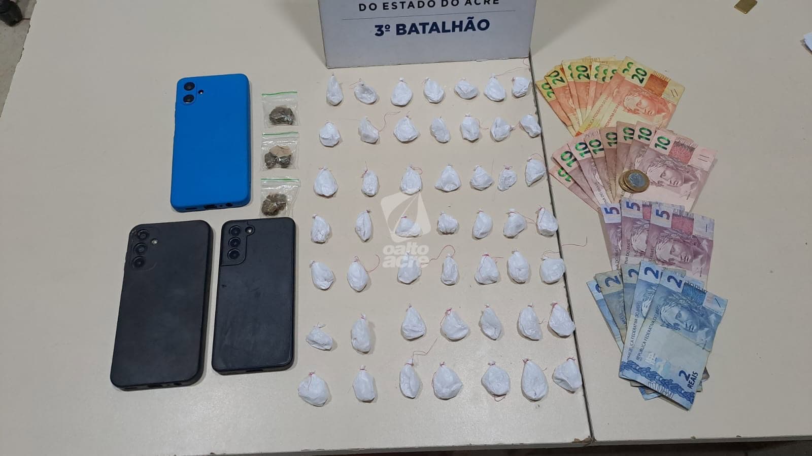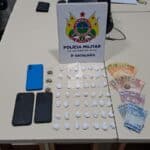 Com André Soares, de 23 anos, os policiais encontraram um saco plástico contendo entorpecentes fracionados e dinheiro trocado. Foram apreendidos 49 papelotes de substância semelhante à pasta base de cocaína, totalizando aproximadamente 24 gramas, além de três porções de substância semelhante à maconha do tipo skunk, com cerca de 4 gramas, e dinheiro em espécie.