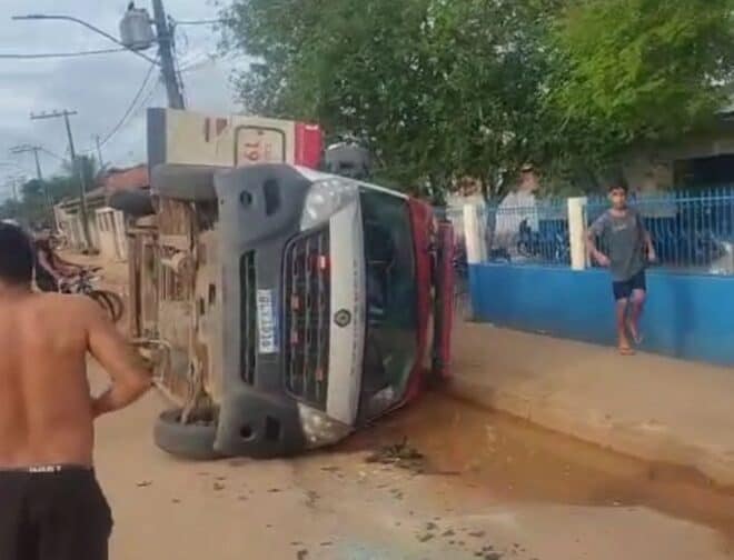 Uma ambulância tombou no meio da rua após colidir com uma caminhonete na tarde deste sábado (15), em Sena Madureira. O acidente aconteceu em frente à Secretaria Municipal de Saúde, no Bairro Vitória, e chamou a atenção de moradores e servidores que estavam no local.