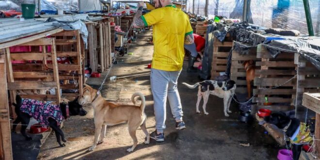 Bem próximo dali, em um terreno ao lado da estação de trem do bairro Mathias Velho, um abrigo improvisado exclusivamente por voluntários já acolheu mais de 2,7 mil animais, a maioria cachorros. De acordo com o boletim da Defesa Civil estadual, divulgado nessa terça-feira (21), 12.358 animais foram resgatados no estado. A maioria está em abrigos provisórios como esse de Canoas.