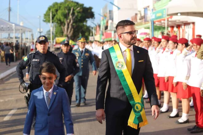 No início da celebração, o governador Gladson Cameli, ao lado do filho Guilherme Cameli, fez a tradicional revista às tropas com a presença de alunos dos colégios militares Tiradentes e Dom Pedro II, de Rio Branco.
