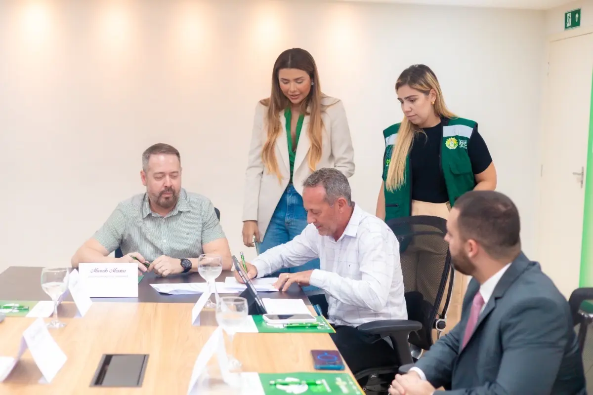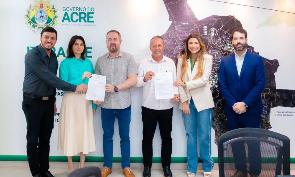 A assinatura do acordo aconteceu na sede do ITERACRE, em Rio Branco, com a presença da presidente do instituto, Gabriela Câmara, e do presidente da COLONACRE, Marcelo Messias. Também acompanharam o ato a juíza auxiliar da Corregedoria do Tribunal de Justiça do Acre, Thais Queiroz, o cartorário de Acrelândia, Thiago Vasconcelos, o prefeito Olavo Francelino e o presidente da Câmara Municipal, Vitor Martinelli.
