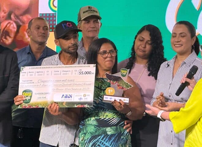 A 3ª edição do Concurso de Qualidade do Café Robusta Amazônico do Acre – Qualicafé premiou, nesta sexta-feira (10), em Rio Branco, os produtores que se destacaram pela excelência na produção de cafés especiais. O evento é uma realização do Governo do Estado do Acre, por meio da Secretaria de Estado de Agricultura, em parceria com o Sebrae e o Idaf, e tem se consolidado como uma importante vitrine para o fortalecimento da cafeicultura acreana.