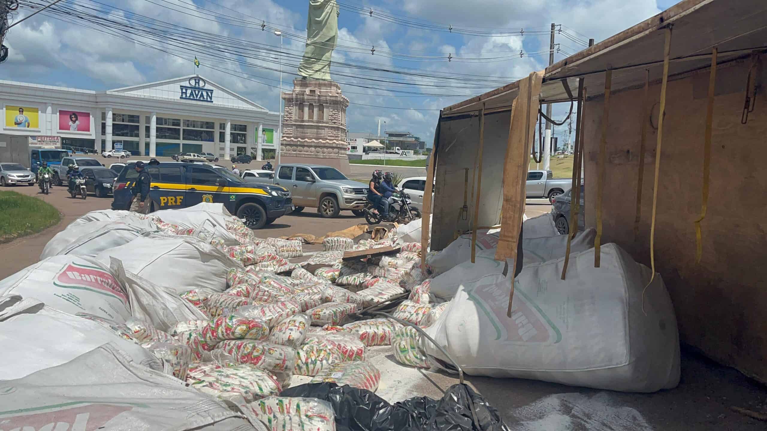Carreta bitrem tomba na rotatória da Havan e espalha carga de açúcar na BR-364, em Rio Branco