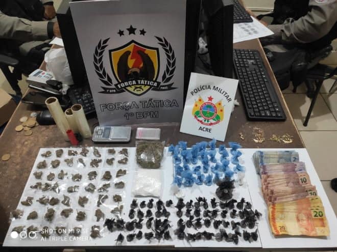 Militares do Primeiro Batalhão de Polícia Militar (1° BPM) aprenderam na tarde deste sábado, 03, uma adolescente de 16 anos e prenderam um homem de 18 anos, com 89 trouxinhas de cocaína, 48 tabletes de skank, uma barra maior também de skank (um tipo de maconha mais potente) e um pacote de pasta à base de cocaína. A ação ocorreu no bairro Bahia Nova, em Rio Branco, após denúncia anônima.