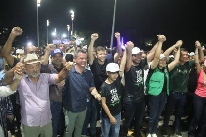 Ao fim da solenidade, Camelí comemorou com a população. Foto: Neto Lucena/Secom