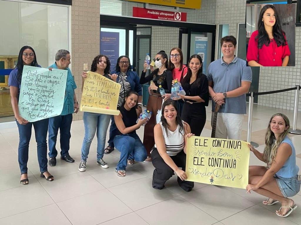 Ao desembarcar em Cruzeiro do Sul, Rocheli foi surpreendida por amigos e membros da igreja Presbiteriana, que a receberam no aeroporto com cartazes e garrafas de água mineral. Foto: cedida