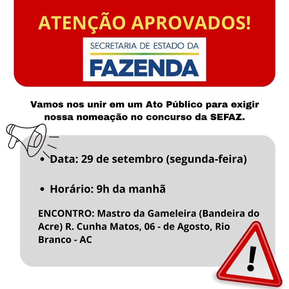 Candidatos aprovados no concurso da Secretaria de Estado da Fazenda do Acre (Sefaz-AC) vão realizar, na próxima segunda-feira (29), um ato público em Rio Branco para exigir a imediata nomeação dos classificados. A manifestação está marcada para às 9h, no Mastro da Gameleira, ponto simbólico onde fica hasteada a Bandeira do Acre.